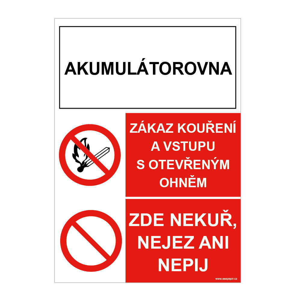 Akumulátorovna - zákaz kouření a vstupu s otevřeným ohněm - zde nekuř, nejez ani nepij, samolepka a4