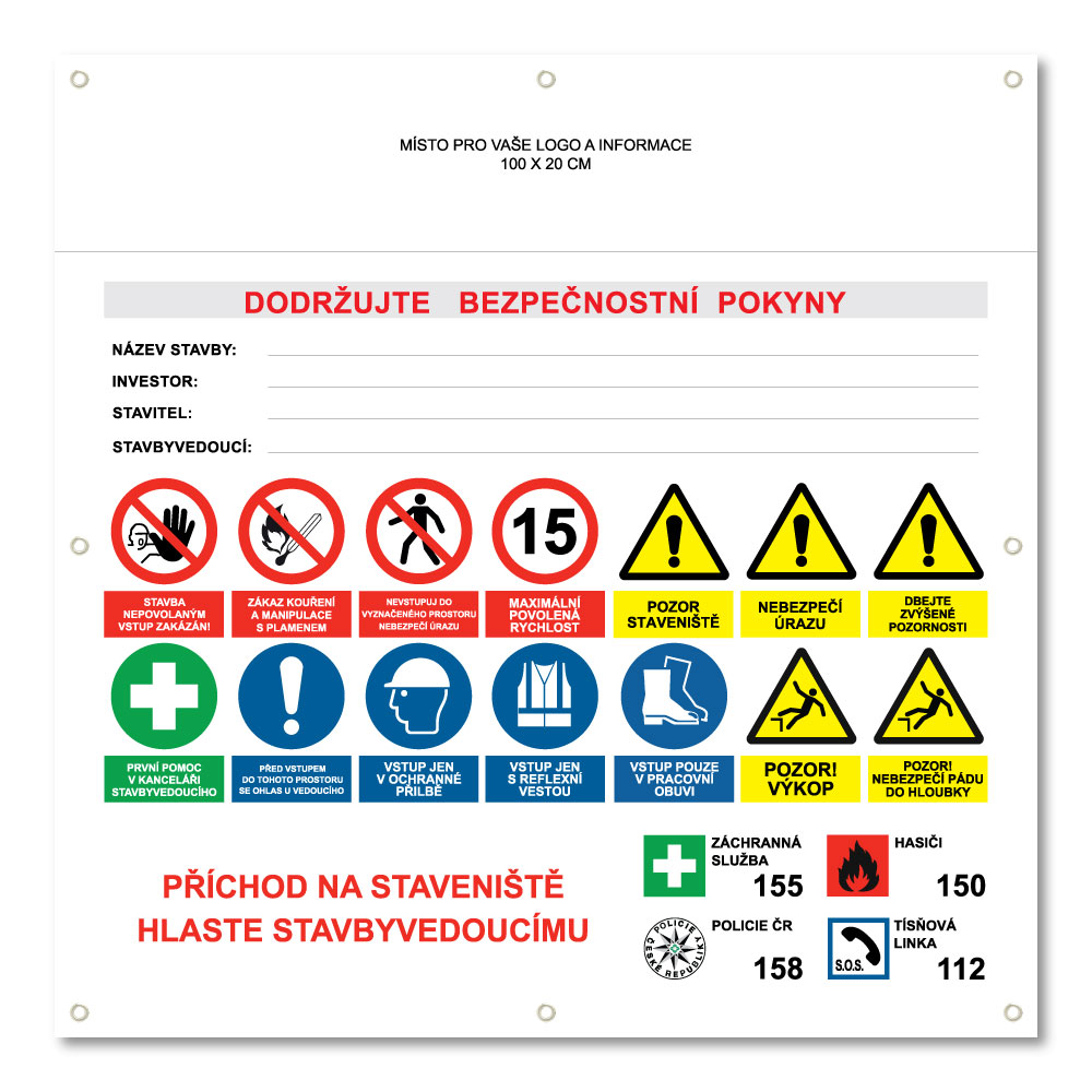 Bezpečnostní banner doplníme Vašim logem a dle přání Vám doplníme i jmenné údaje (stavbyvedoucí, investor atd.).