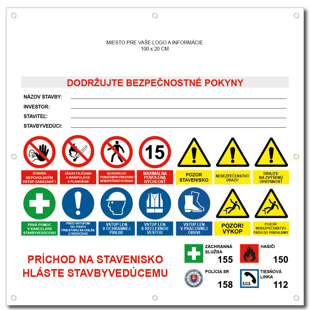 Bezpečnostný banner doplníme Vašim logom a podľa priania Vám doplníme aj osobné údaje (stavbyvedúci, investor atď.).