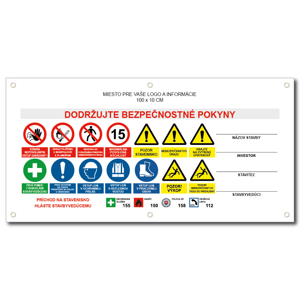 Bezpečnostný banner doplníme Vašim logom a podľa priania Vám doplníme aj osobné údaje (stavbyvedúci, investor atď.).