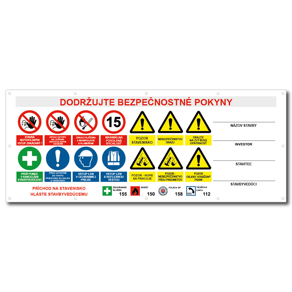 Bezpečnostný banner Rozmer: 100 x 80 cm Materiál: PVC 520g / m2 s trvanlivosťou 5 rokov Tlač: UV LED s trvanlivosťou 3 roky (farebná stálosť). Bezpečnostný banner je opatrený kovovými očkami min. každých 50 cm k jednoduchému zaveseniu. Bezpečnostný bann
