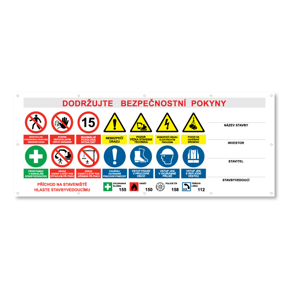 Bezpečnostní banner - areál stavby Rozměr: 100 x 80 cm Materiál: PVC 520g/m2 s trvanlivostí 5 let Tisk: UV LED s trvanlivostí 3 roky (barevná stálost). Bezpečnostní banner je opatřen kovovými očky min. každých 50 cm k jednoduchému zavěšení. Bezpečn