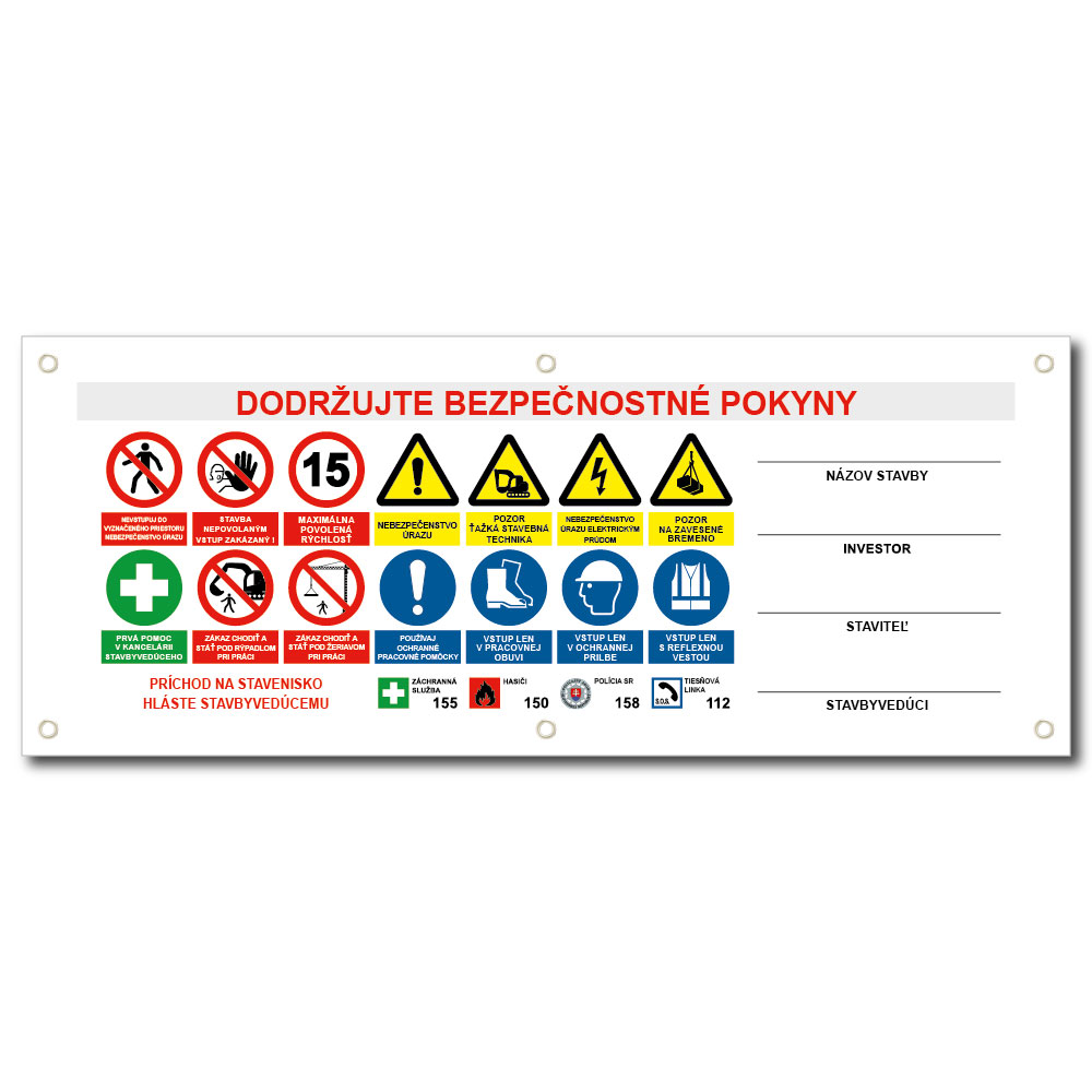 Bezpečnostný banner Rozmer: 100 x 80 cm Materiál: PVC 520g / m2 s trvanlivosťou 5 rokov Tlač: UV LED s trvanlivosťou 3 roky (farebná stálosť). Bezpečnostný banner je opatrený kovovými očkami min. každých 50 cm k jednoduchému zaveseniu. Bezpečnostný bann