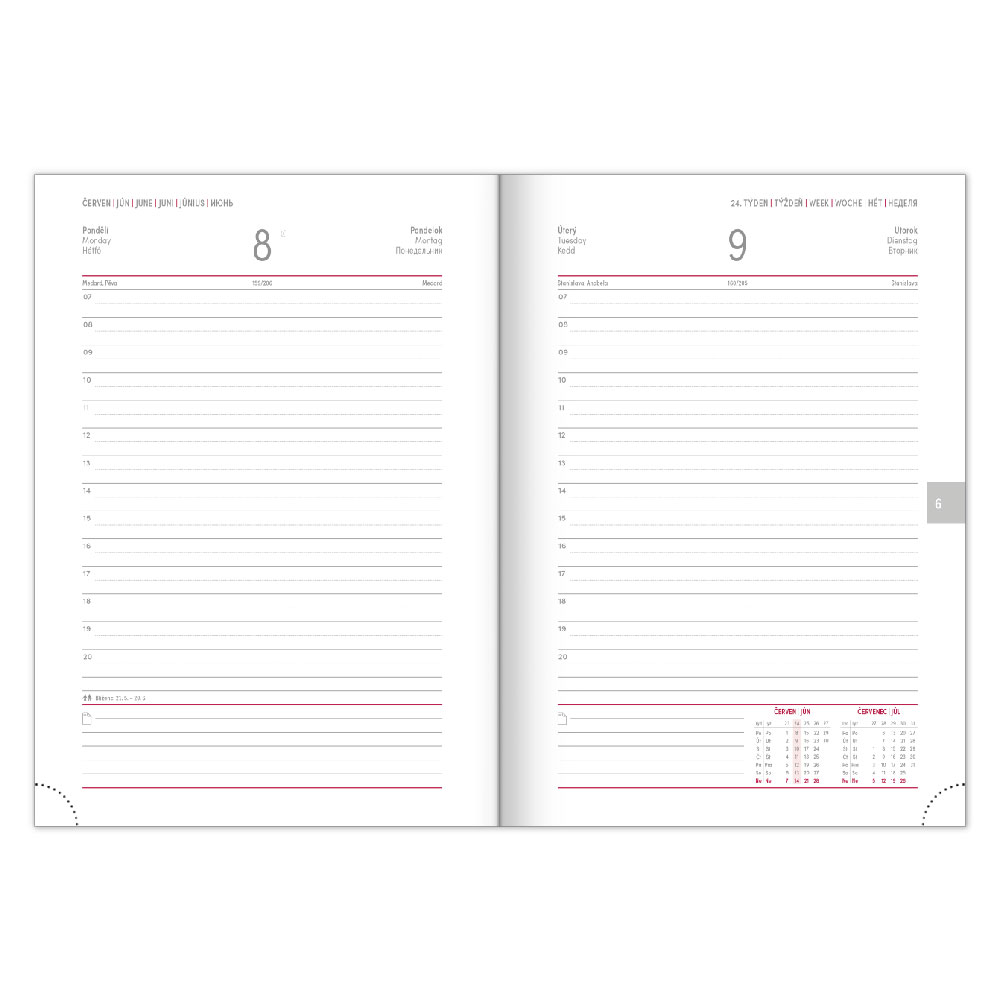 Diár obsahuje: miesto pre osobné údaje, mesačné plánovanie 202