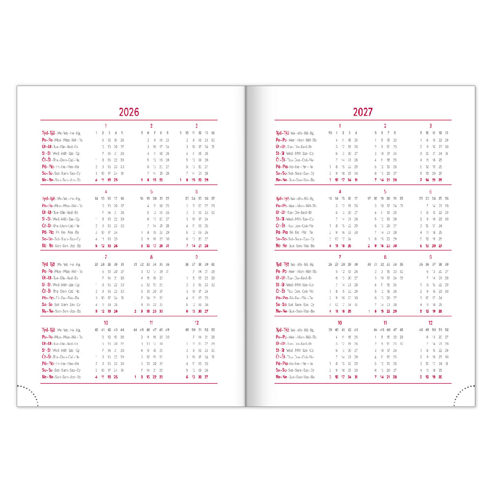 Diár obsahuje: miesto pre osobné údaje, mesačné plánovanie 2026 a 2027,
