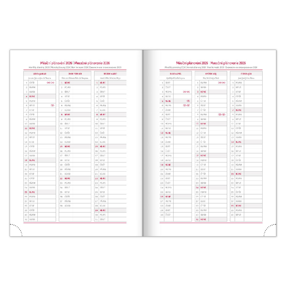 Diár obsahuje: miesto pre osobné údaje, mesačné plánovanie 2026 a 2027,