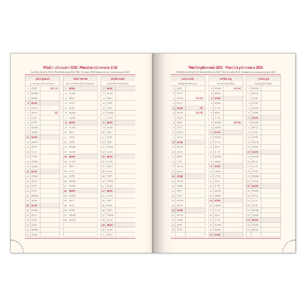 Diár obsahuje: miesto pre osobné údaje, mesačné plánovanie