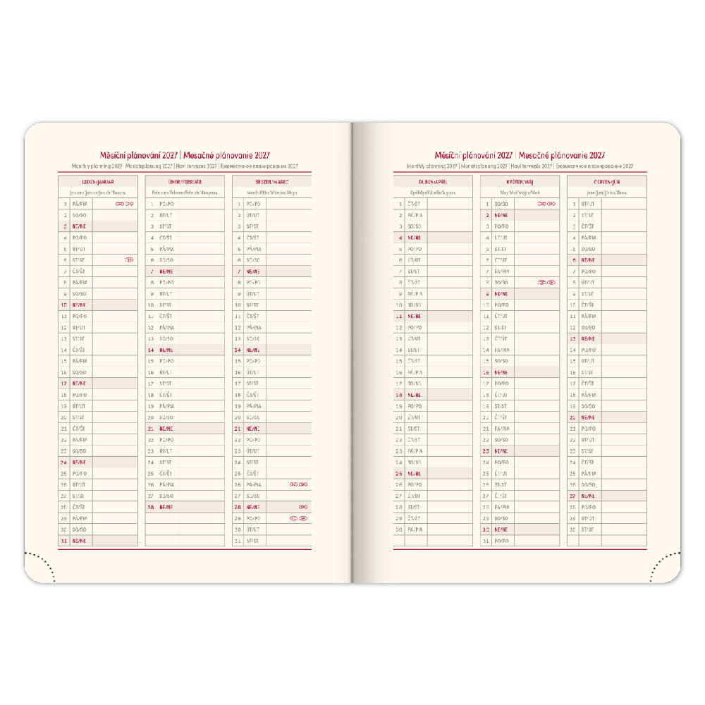 Diár obsahuje: miesto pre osobné údaje, mesačné plánovanie 2026 a 2027,
