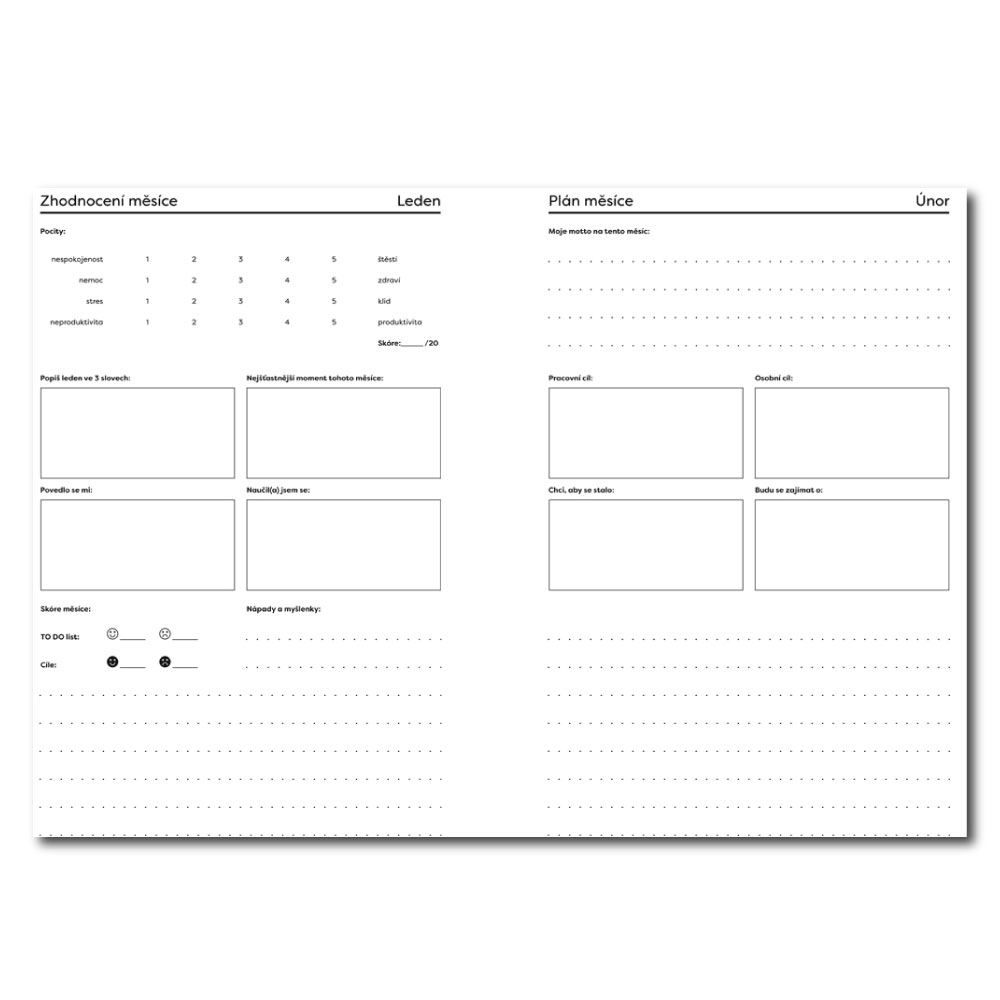 • nedatovaný plánovač obsahuje mesačné a každodenné prehľady, miesto pre poznámky či kresby a mesačné vyhodnotenie.
