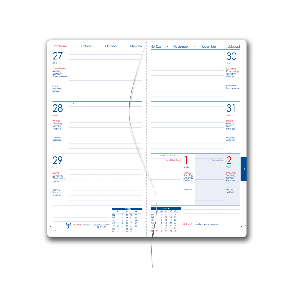 Diár obsahuje: krúhle odtrhávacie rožky, bielu záložku a pero