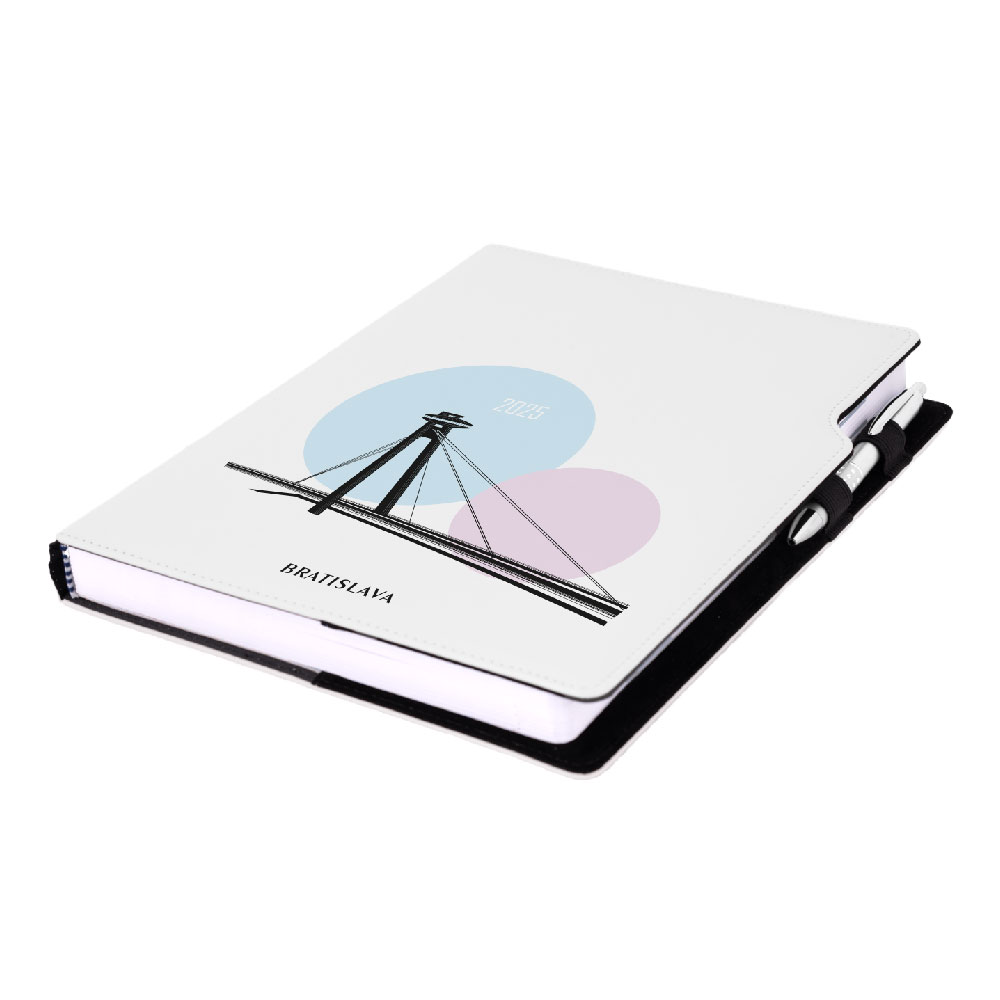 Diár obsahuje: okrúhle odtrhávcie rožky, bielu záložku a pero