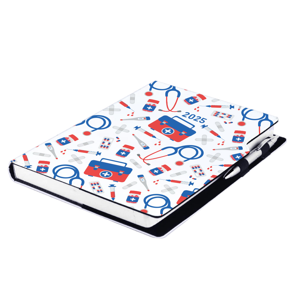 Diár obsahuje: okrúhle odtrhávcie rožky, bielu záložku a pero