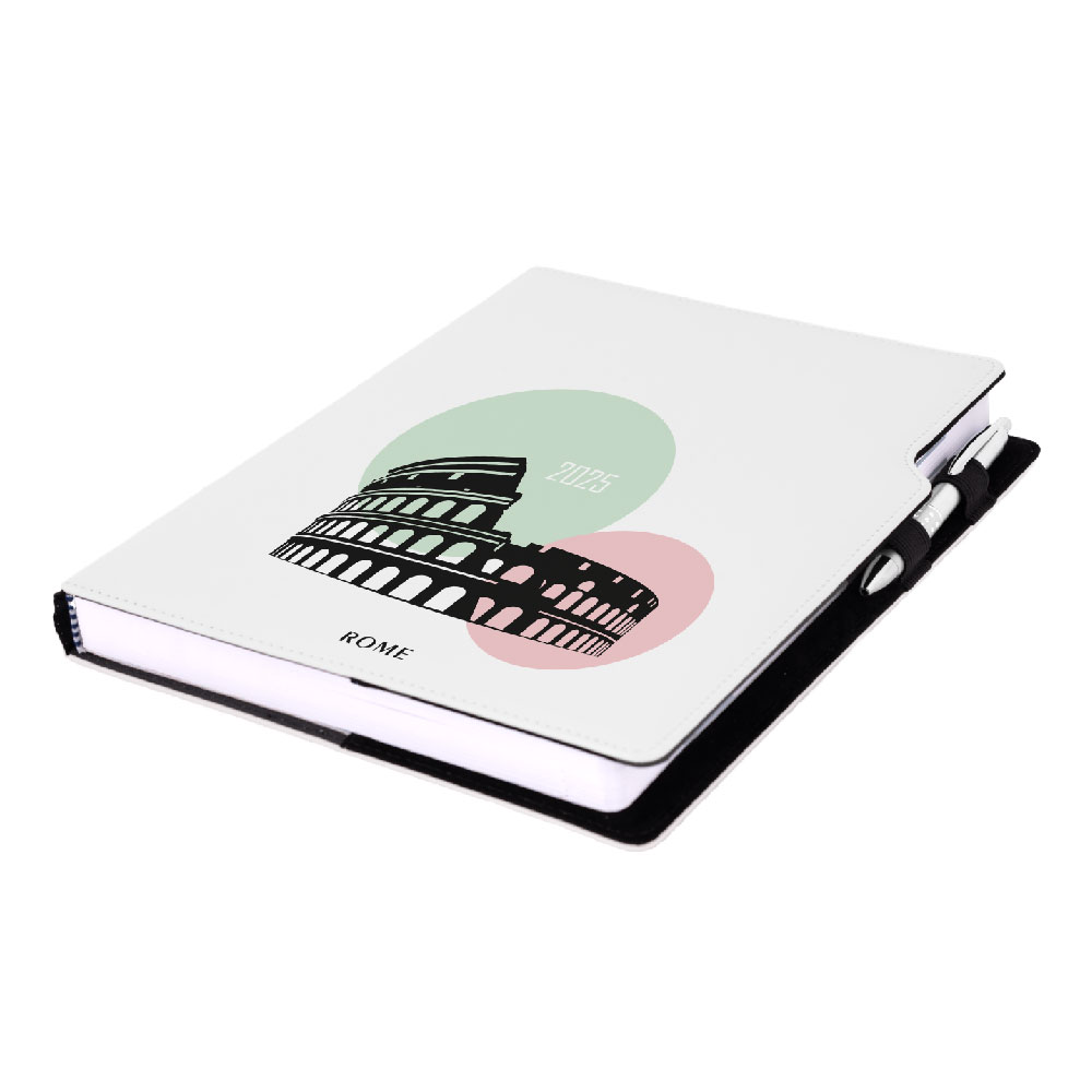 Diár obsahuje: okrúhle odtrhávcie rožky, bielu záložku a pero
