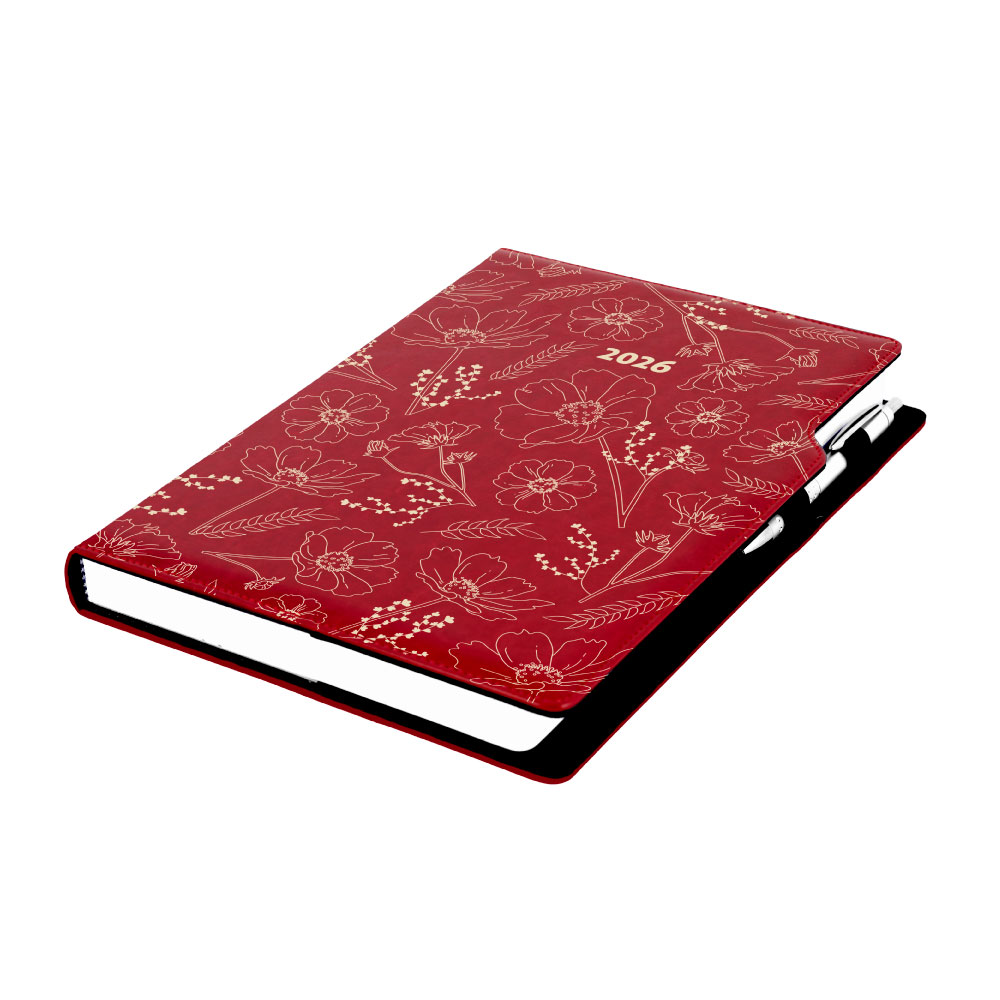 Diár DESIGN denný A4 2026 - bordová - kvety