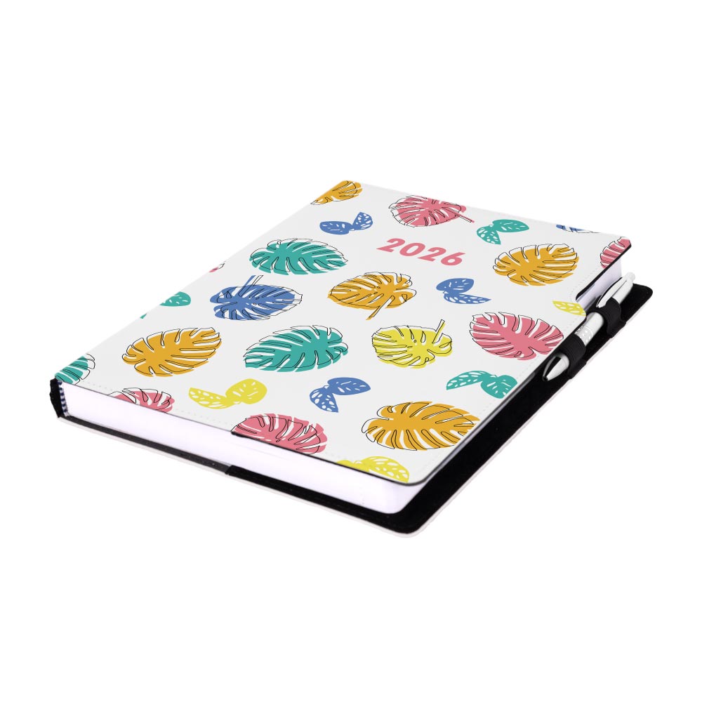 Diár obsahuje: okrúhle odtrhávcie rožky, bielu záložku a pero
