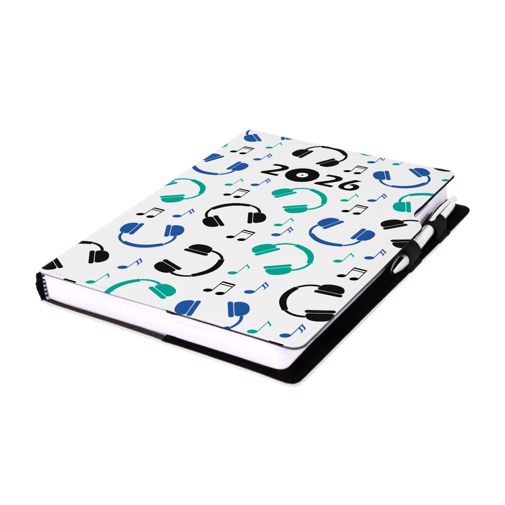 Diár obsahuje: okrúhle odtrhávcie rožky, bielu záložku a pero