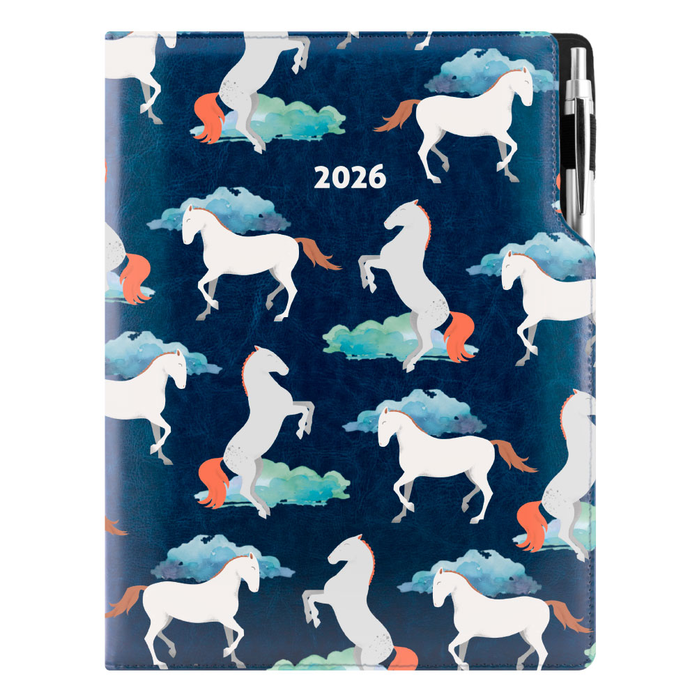 Diár DESIGN denný A4 2026 poľský - modrý - kone