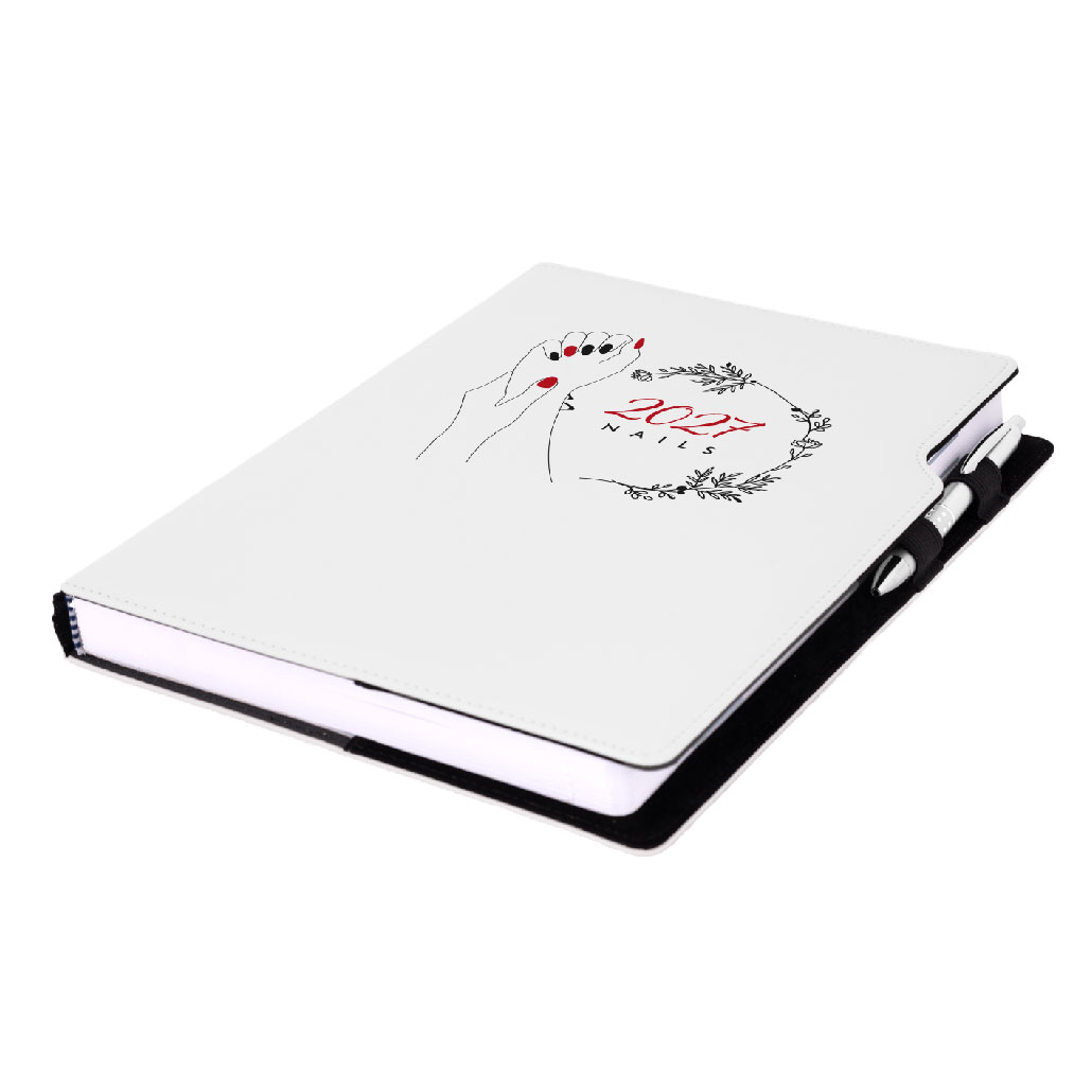 Diár obsahuje: okrúhle odtrhávcie rožky, bielu záložku a pero
