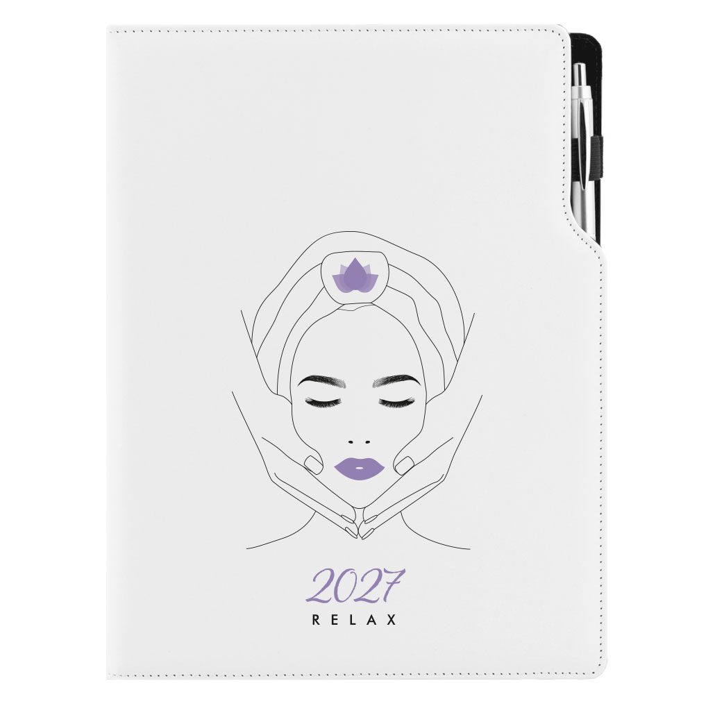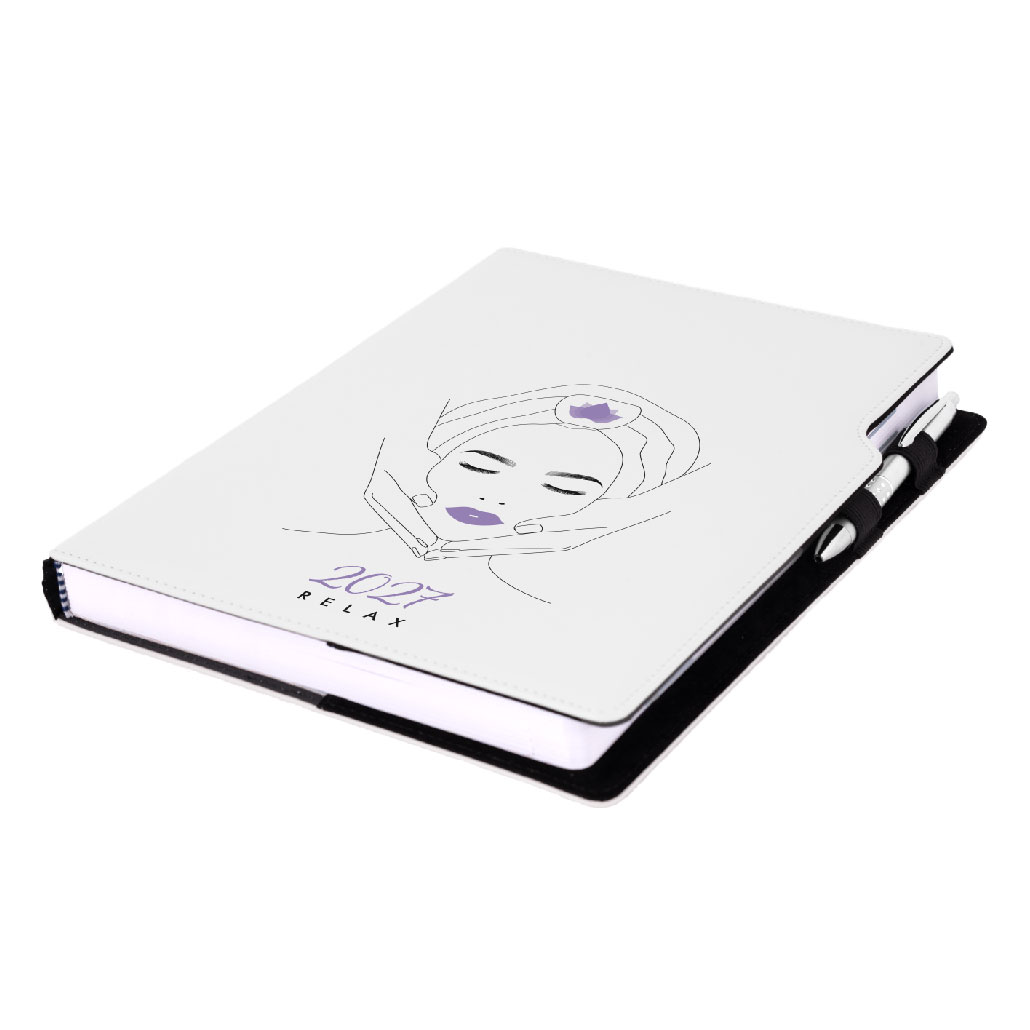 Diár obsahuje: okrúhle odtrhávcie rožky, bielu záložku a pero