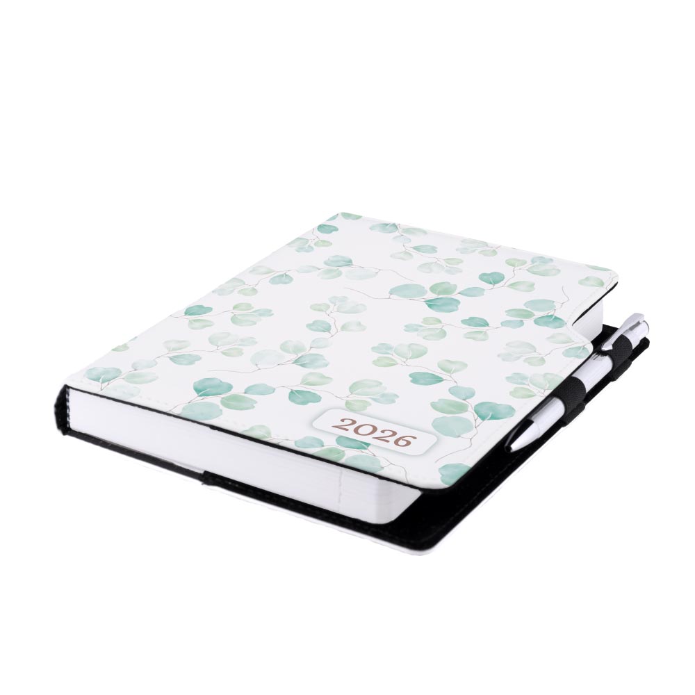 Diár obsahuje: okrúhle odtrhávcie rožky, bielu záložku a pero