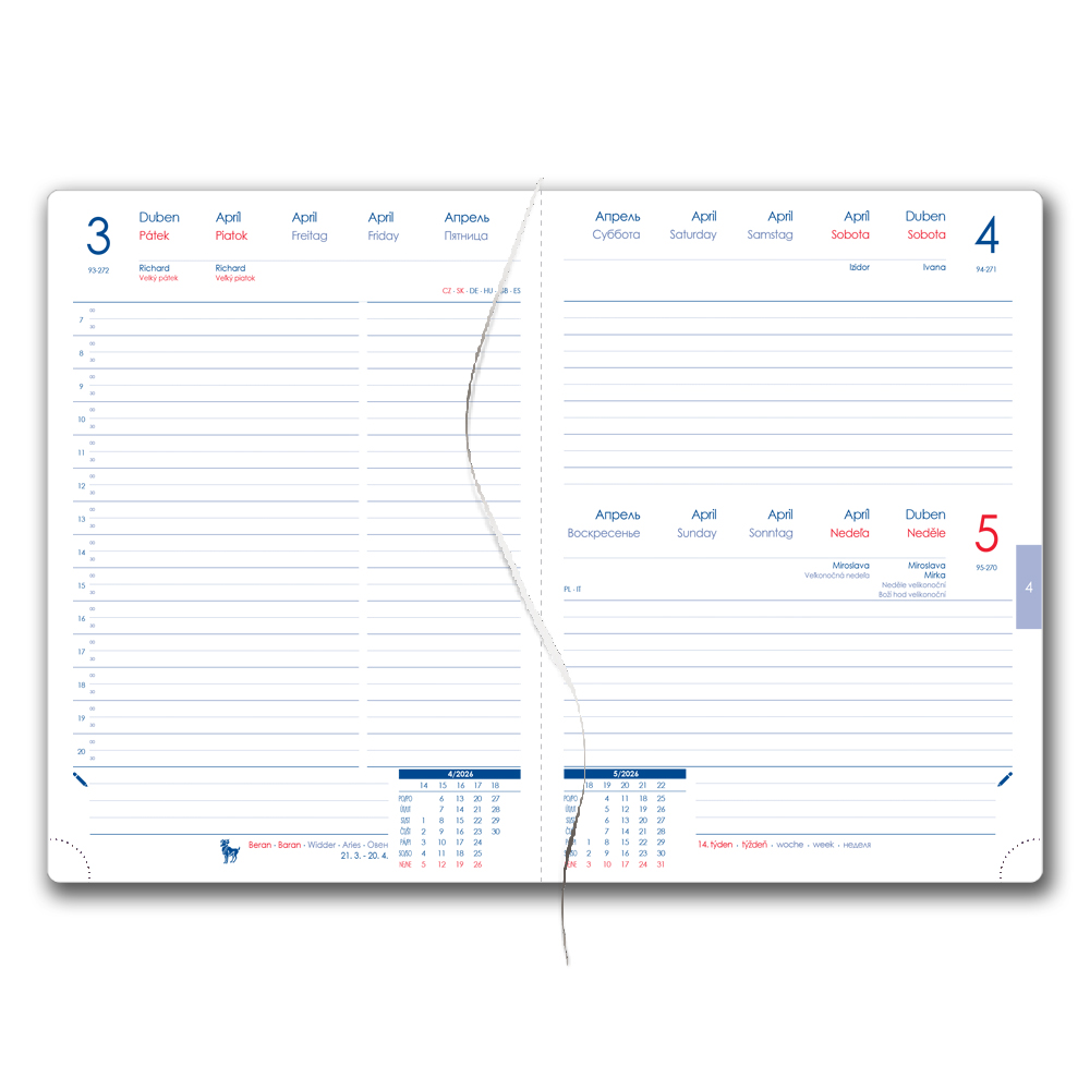 Diár obsahuje: okrúhle odtrhávcie rožky, bielu záložku a pero