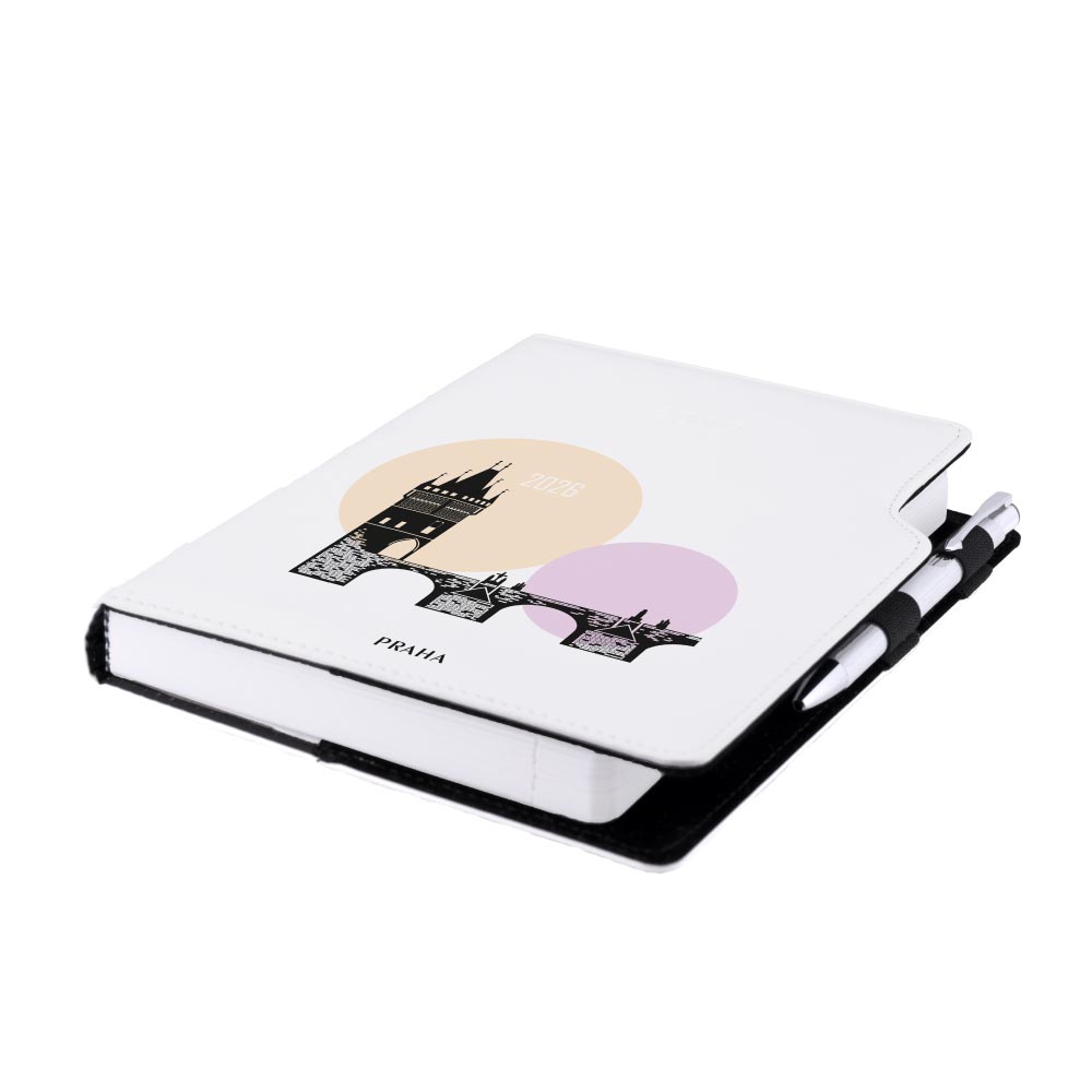 Diár obsahuje: okrúhle odtrhávcie rožky, bielu záložku a pero