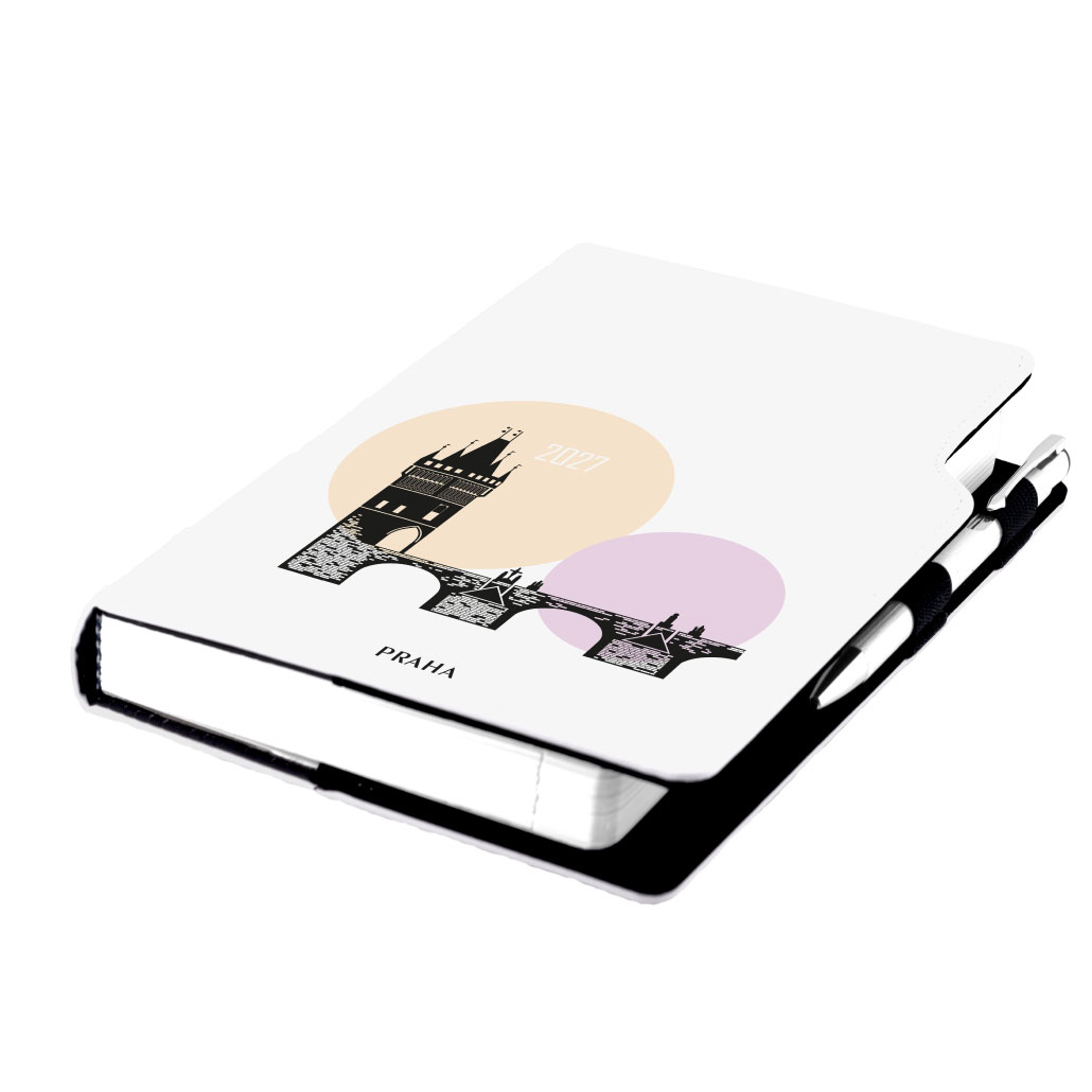 Diár obsahuje: okrúhle odtrhávacie rožky, bielu záložku a per