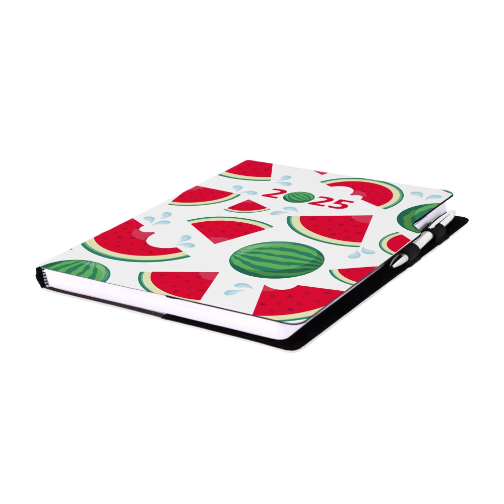 Diár obsahuje: okrúhle odtrhávcie rožky, bielu záložku a pero