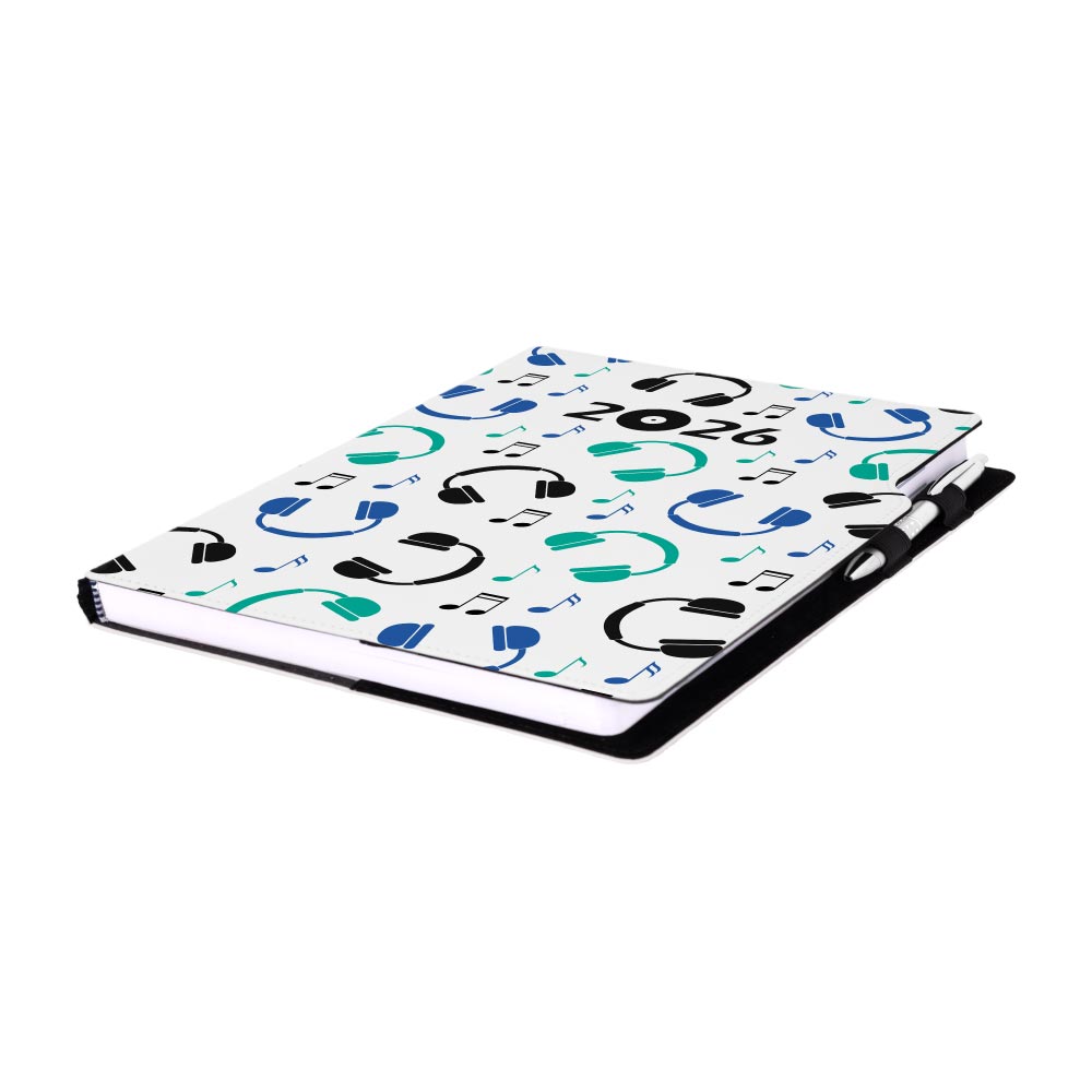 Diár obsahuje: okrúhle odtrhávcie rožky, bielu záložku a pero