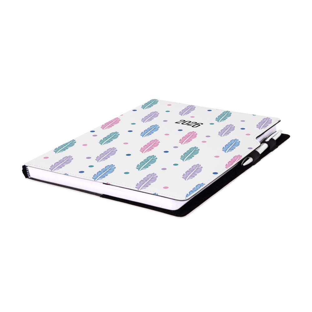 Diár obsahuje: okrúhle odtrhávcie rožky, bielu záložku a pero