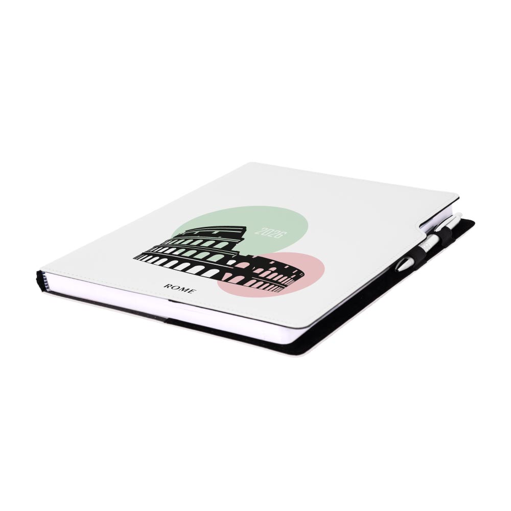 Diár obsahuje: okrúhle odtrhávcie rožky, bielu záložku a pero