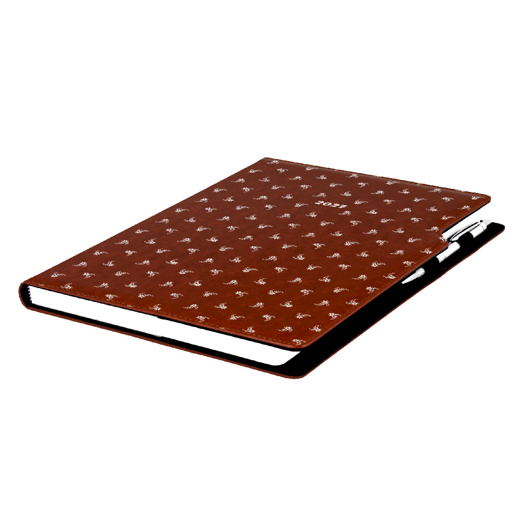 Diár DESIGN týždenný A4 2027 - hnedá - Biely kvet