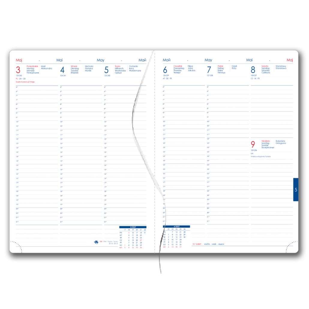 Diár obsahuje: okrúhle odtrhávcie rožky, bielu záložku a pero