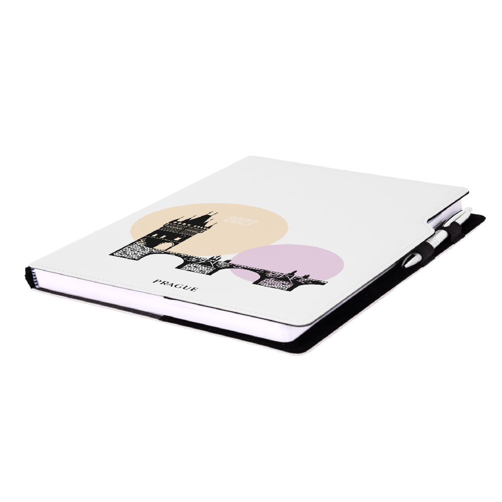 Diár obsahuje: okrúhle odtrhávcie rožky, bielu záložku a pero
