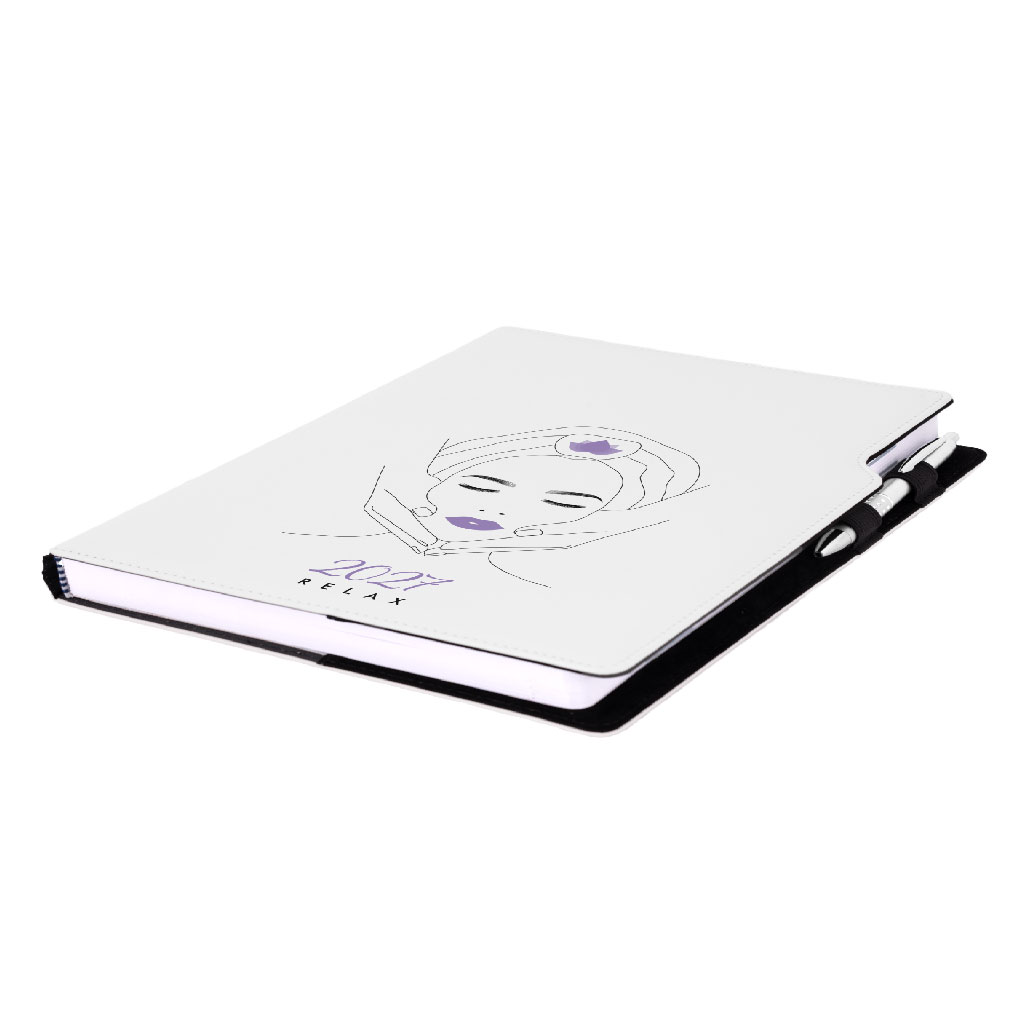 Diár obsahuje: okrúhle odtrhávcie rožky, bielu záložku a pero