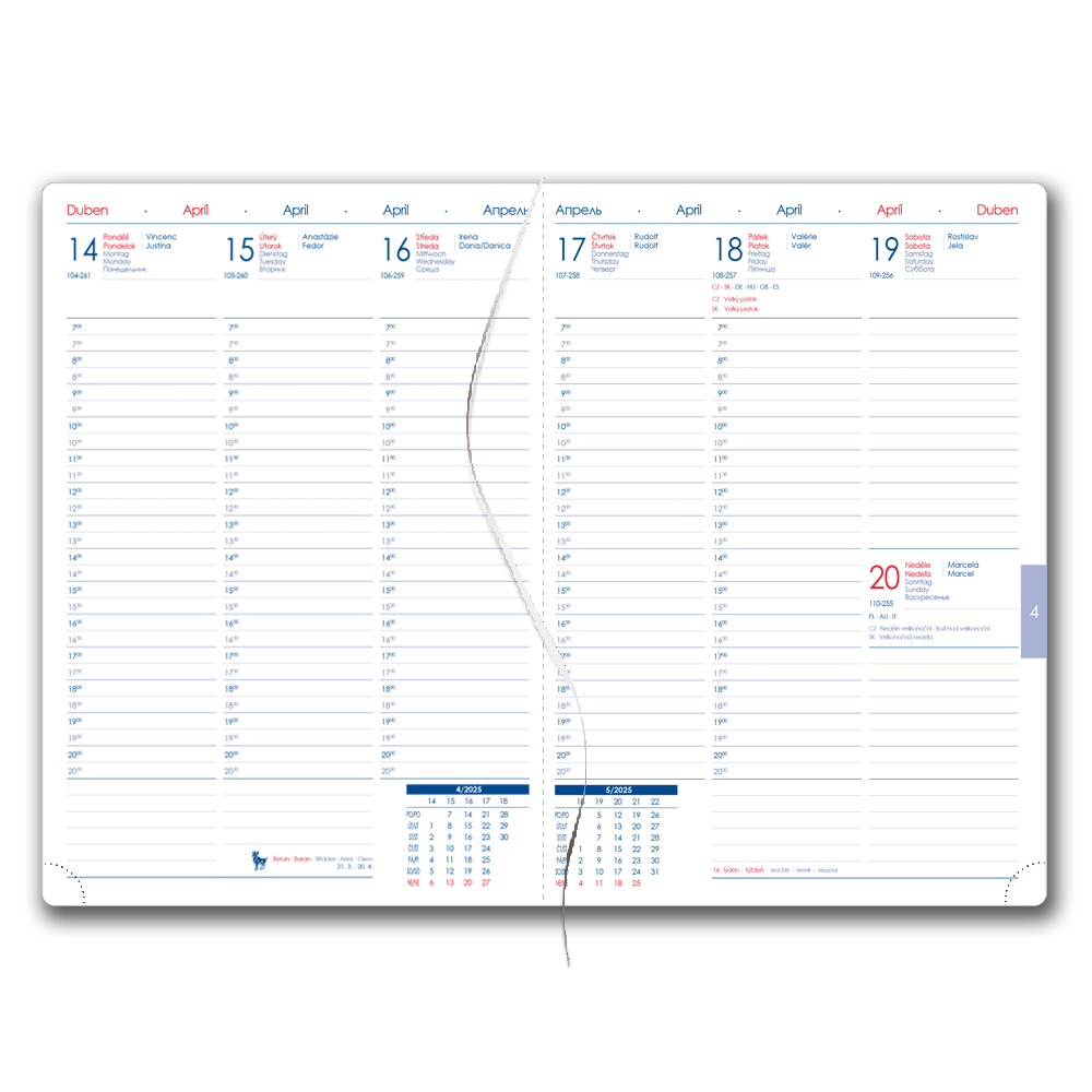Diár obsahuje: okrúhle odtrhávacie rožky, bielu záložku a pero