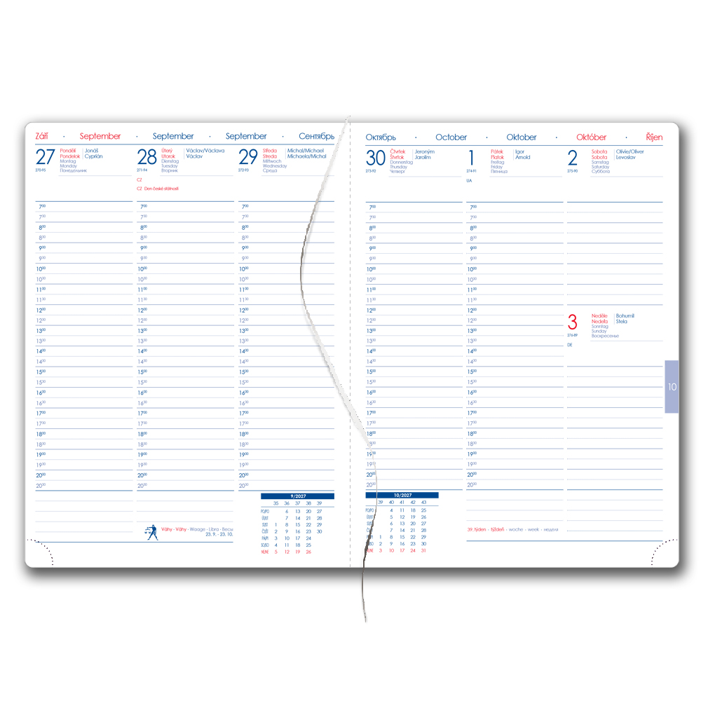 Diár obsahuje: okrúhle odtrhávcie rožky, bielu záložku a pero