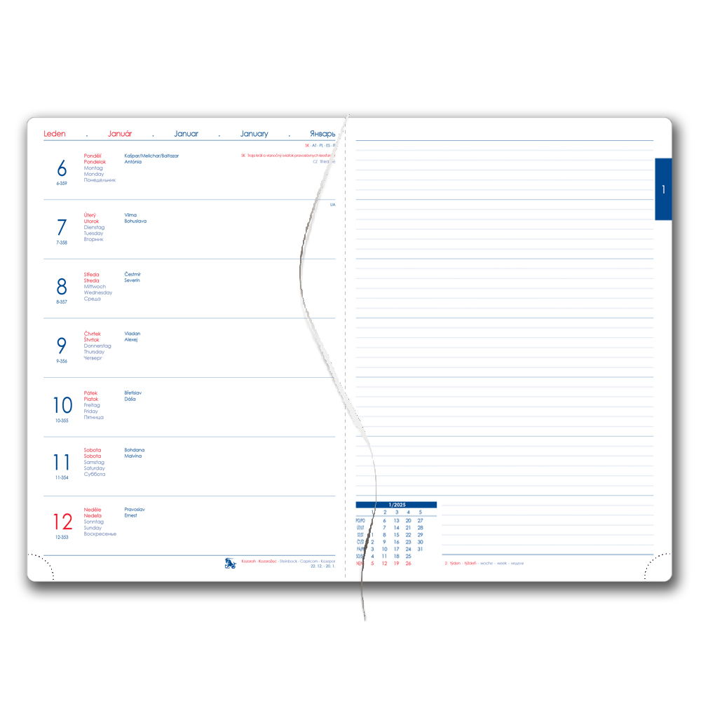 Kalendárium: týždenné menné CZ/SK na jednej strane + samostatná strana na poznámky