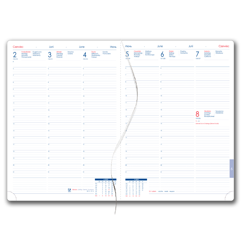 Diár obsahuje: okrúhle odtrhávacie rožky, bielu záložku a pútko na pero