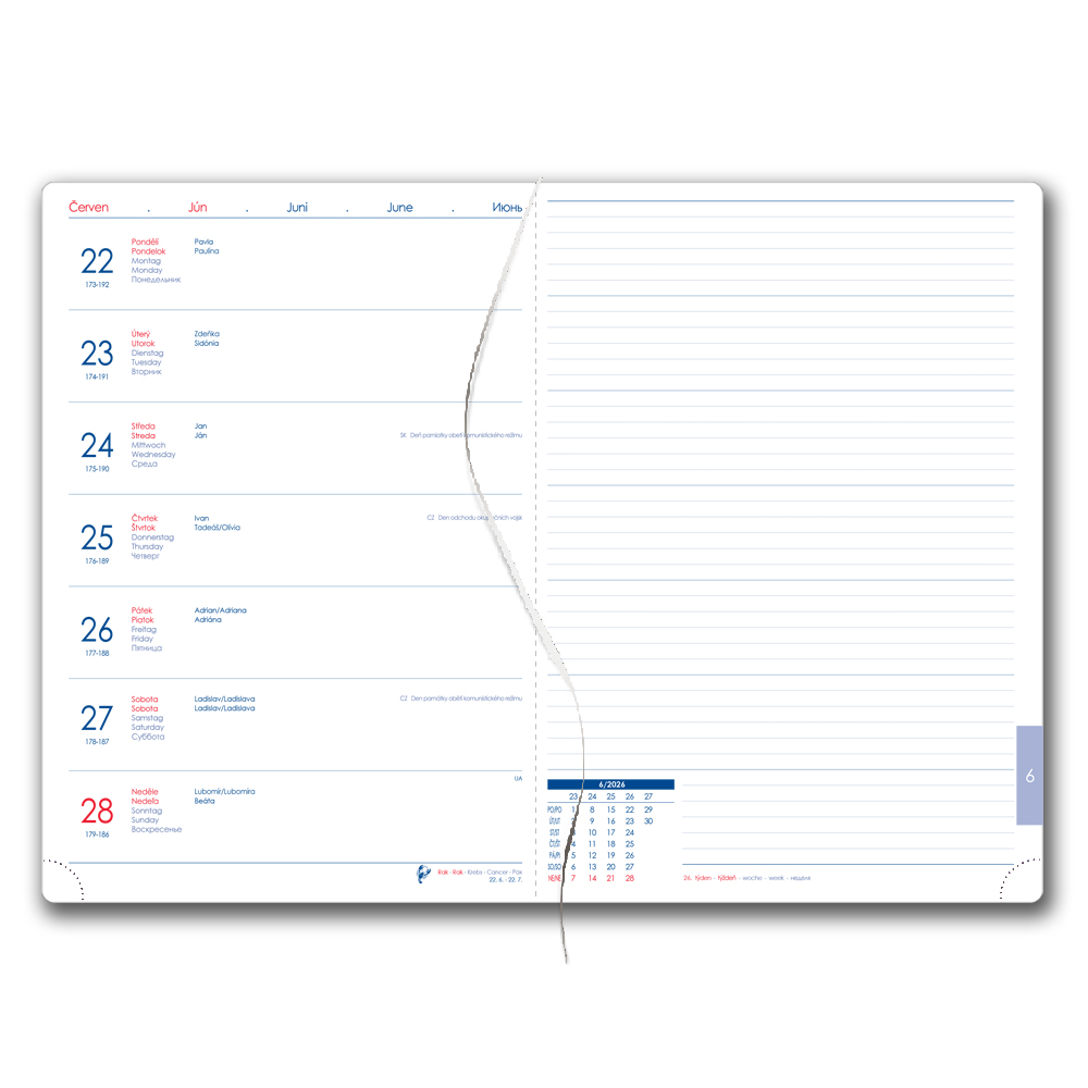 Kalendárium: týždenné menné CZ/SK na jednej strane + strana na poznámky