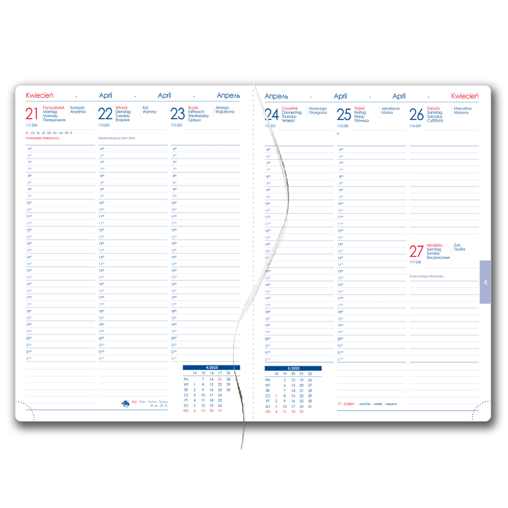 Diár obsahuje: krúhle odtrhávacie rožky, bielu záložku a pero