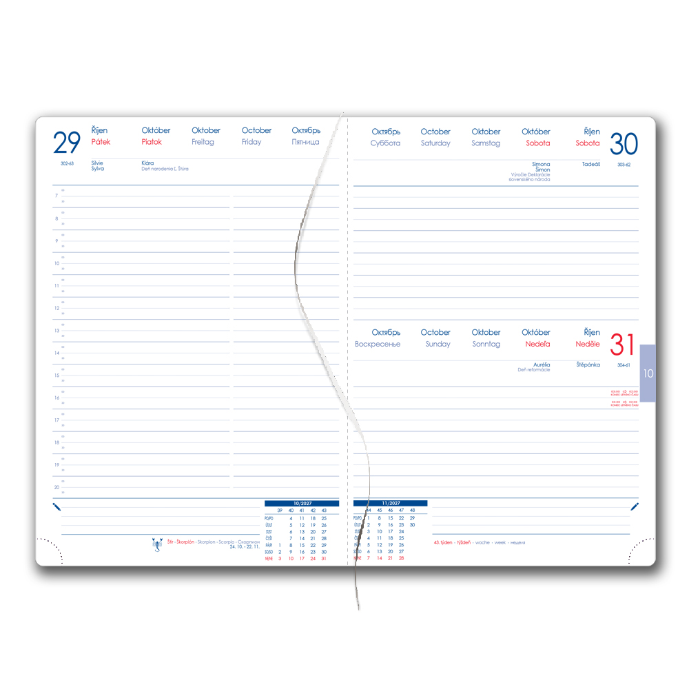 Diár obsahuje: okrúhle odtrhávacie rožky, bielu záložku a pero