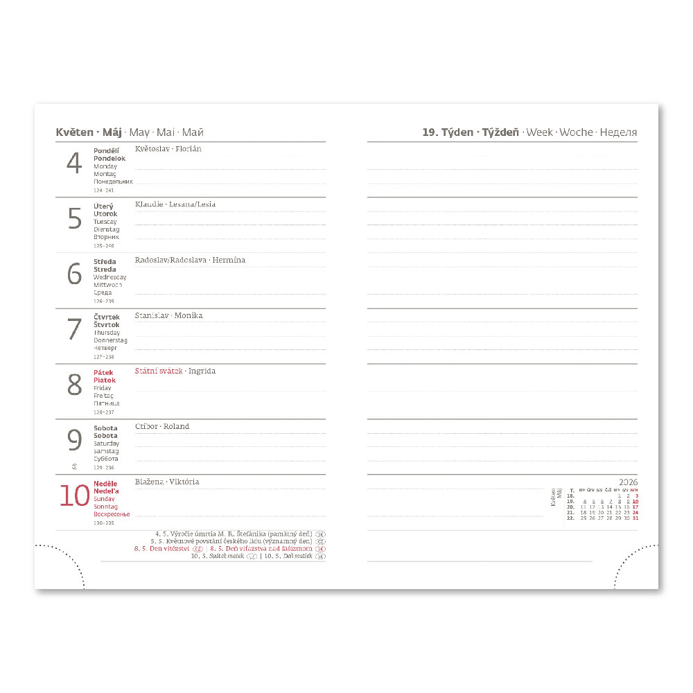 medzinárodné sviatky, ročný výhľad, týždenný layout, adresár.