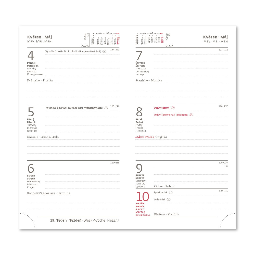 medzinárodné sviatky, ročný výhľad, týždenný layout, adresár.
