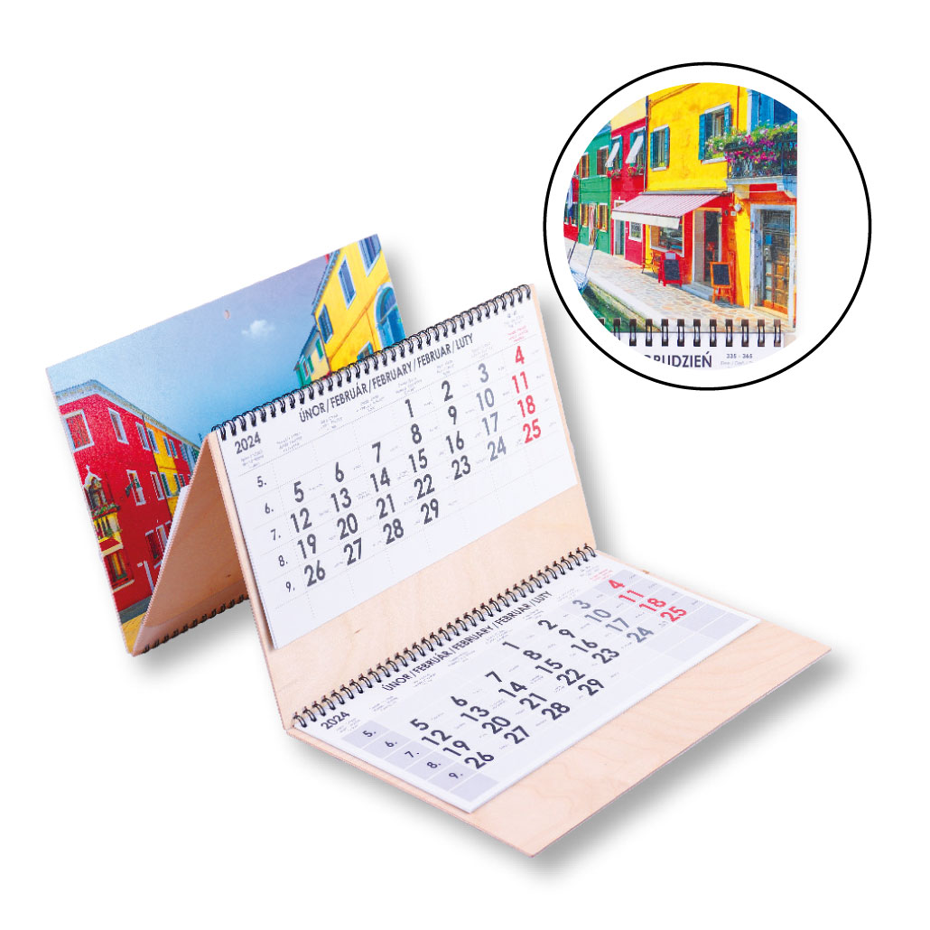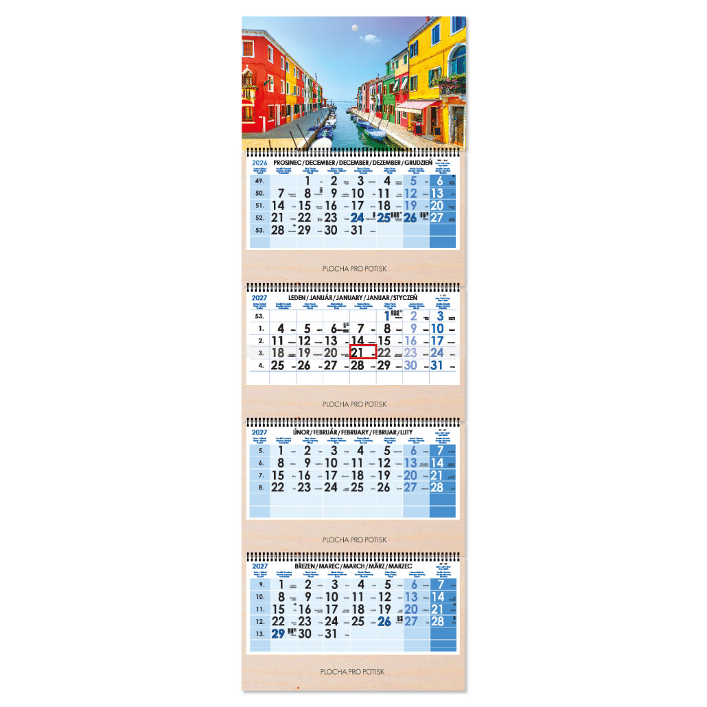 Drevený štvormesačný kalendár Kvatro Wood Benátky skládaný český so špirálou 2027 - modrý