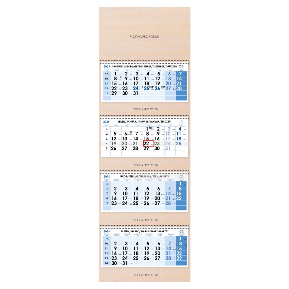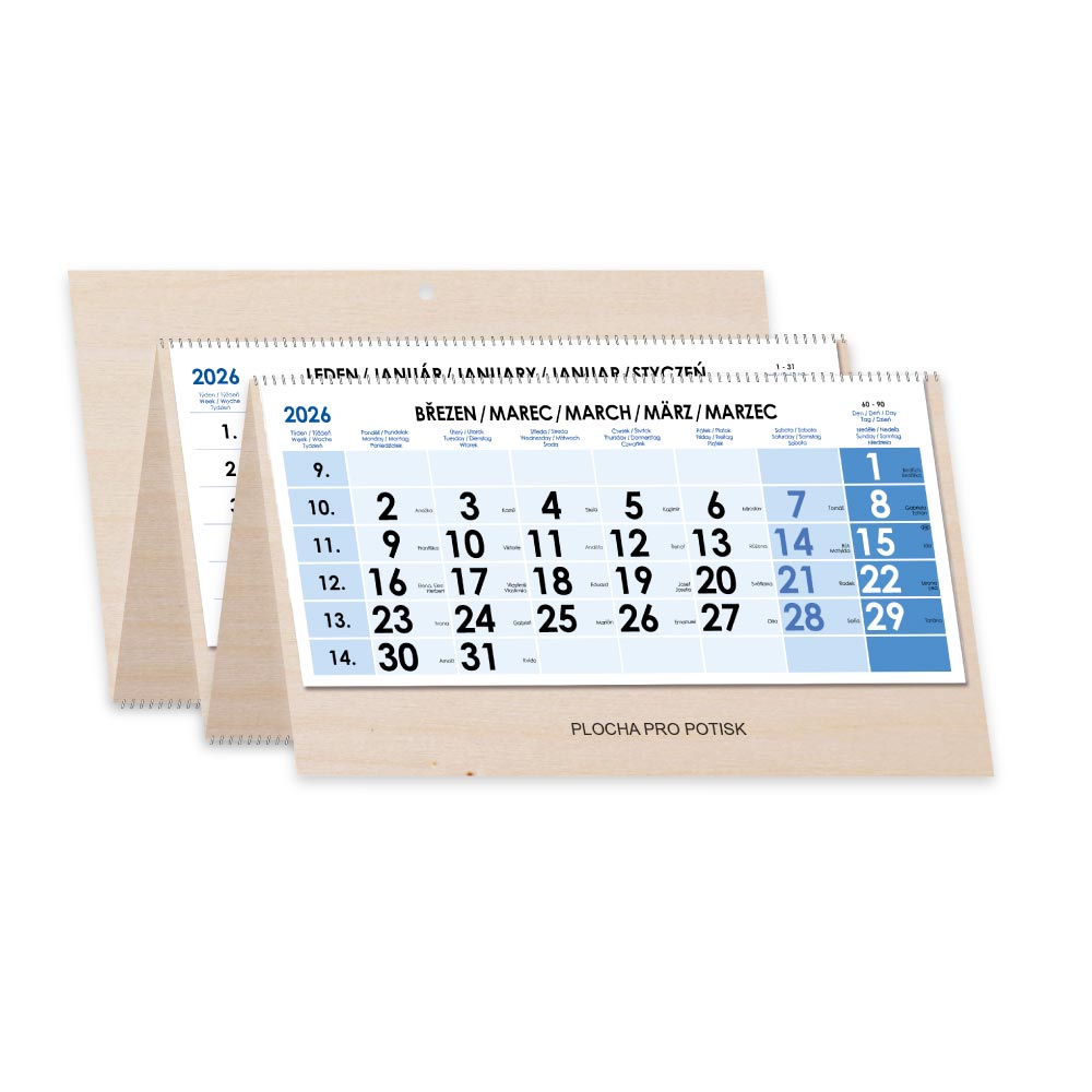 Drevený štvormesačný kalendár Kvatro Wood skládaný český so špirálou 2026 - modrý
