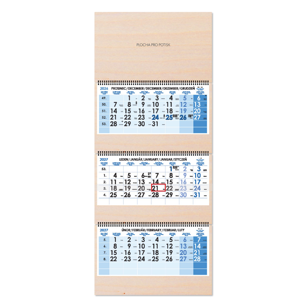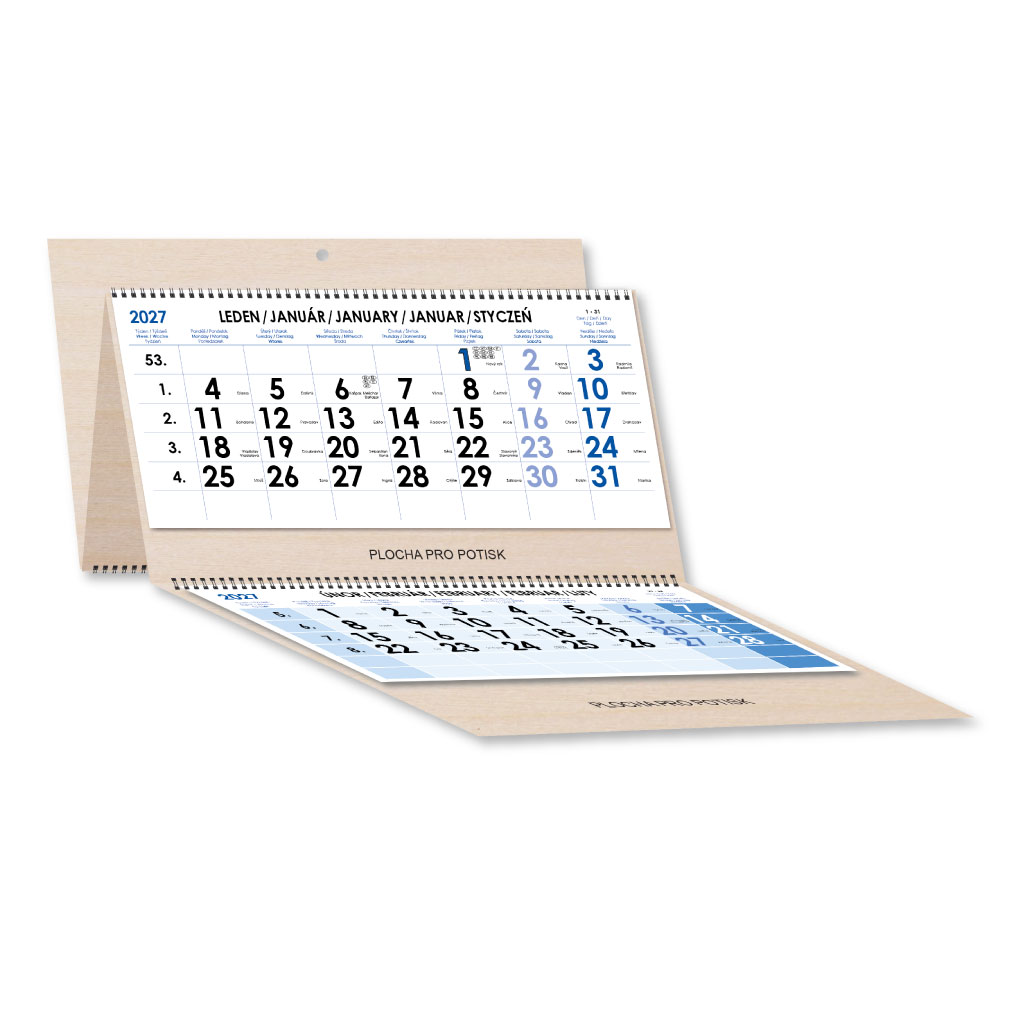 Drevený trojmesačný kalendár Trio Wood skládaný český so špirálou 2027 - modrý