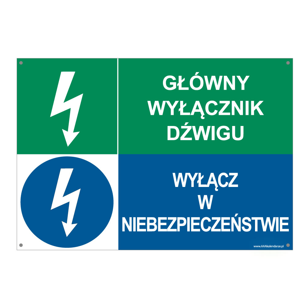 GŁÓNY WYŁĄĆZNIK DŹWIGU - WYŁĄCZ W NIEBEZPIECZEŃSTWIE, ZNAK ŁĄCZONY, płyta PVC 2 mm, 297x210 mm