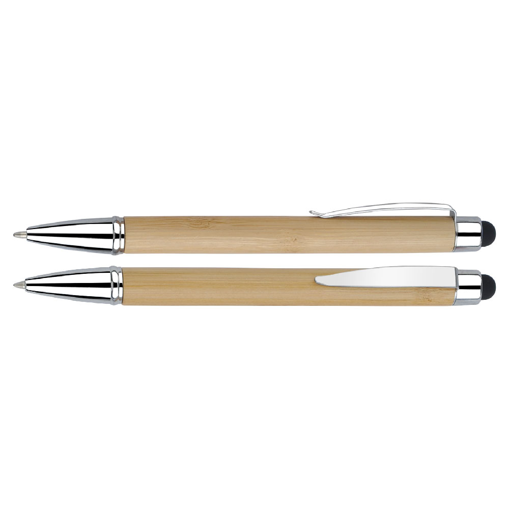 Bambusové guličkové pero s gumou na ovládanie dotykových displejov a kovovým klipom.