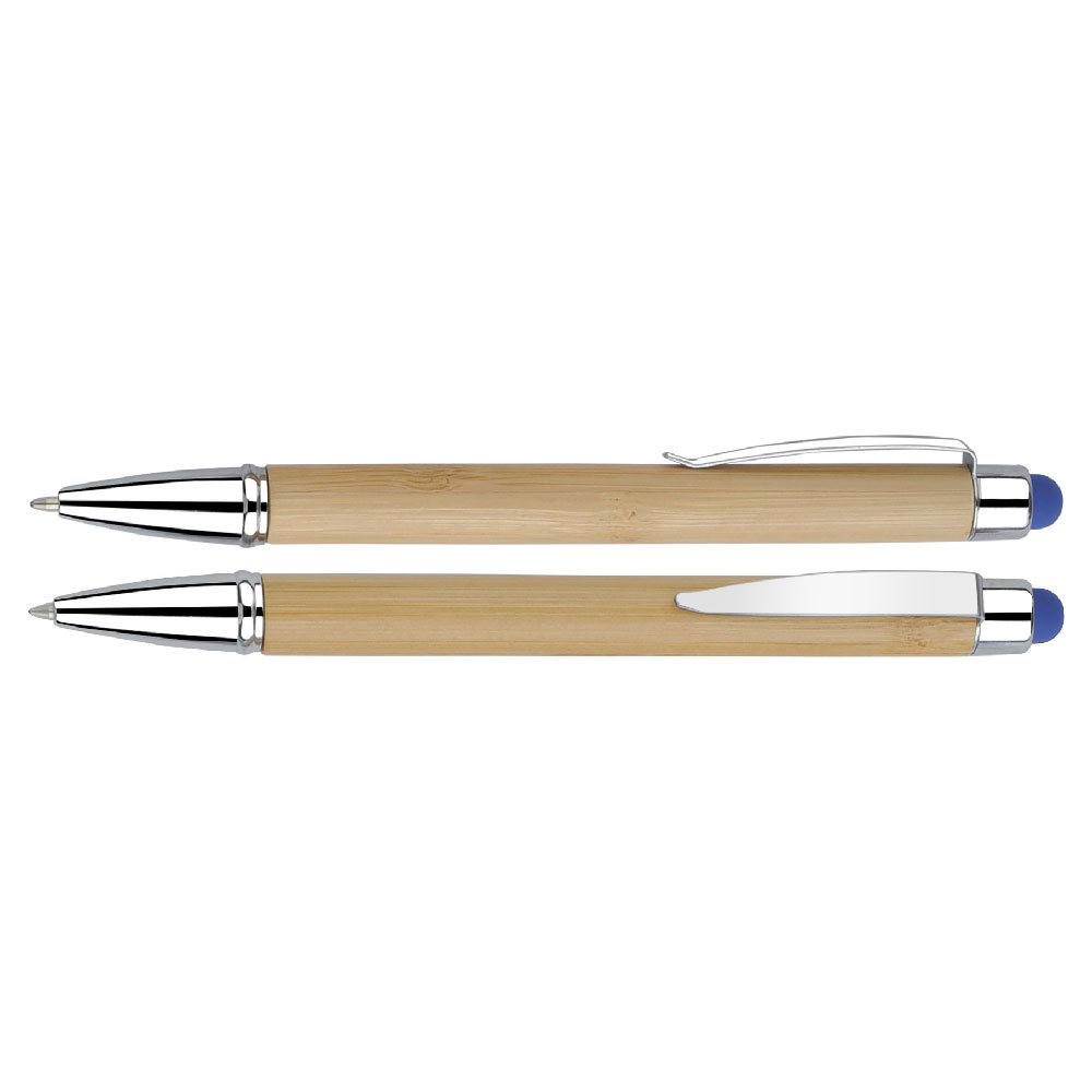 Bambusové guličkové pero s gumou na ovládanie dotykových displejov a kovovým klipom.